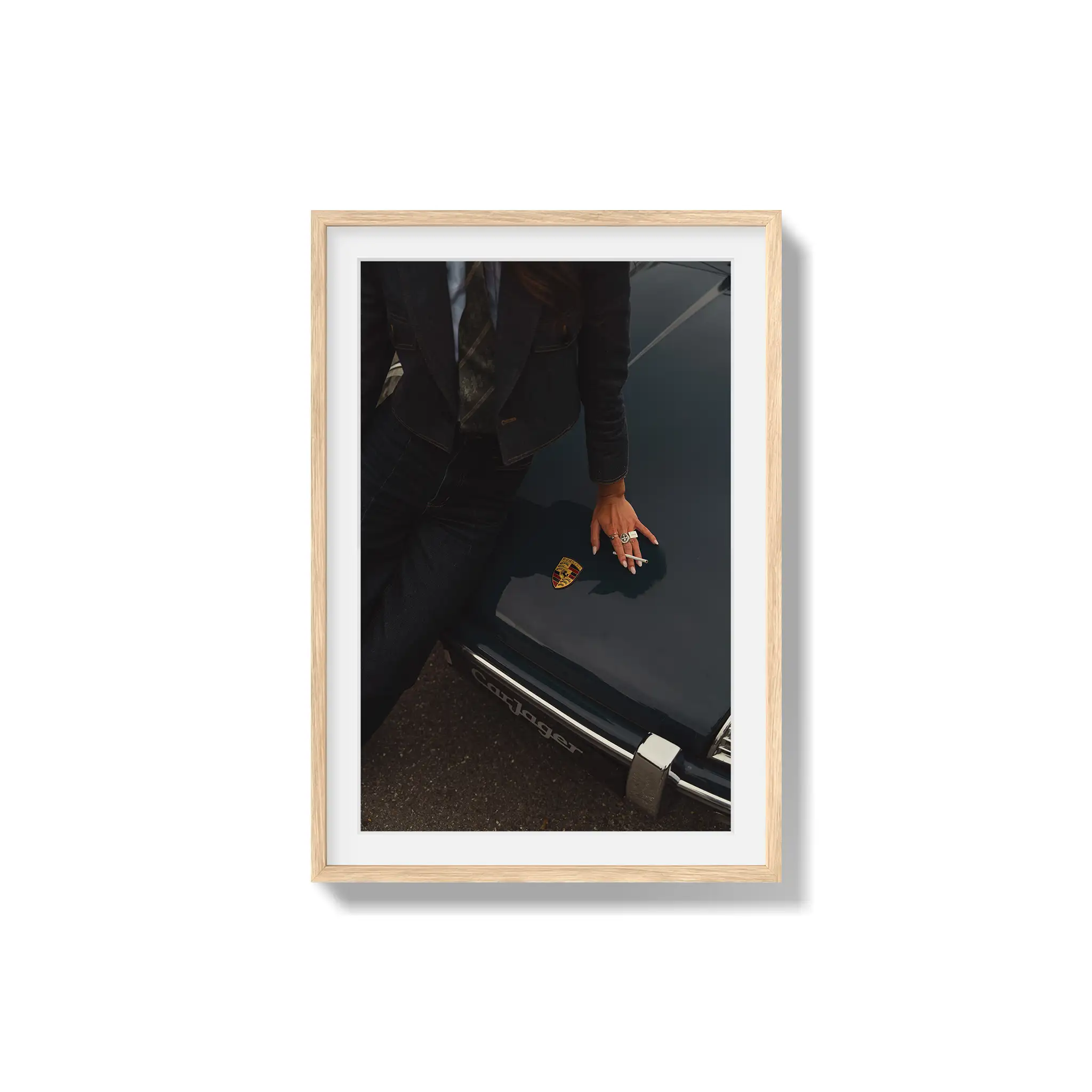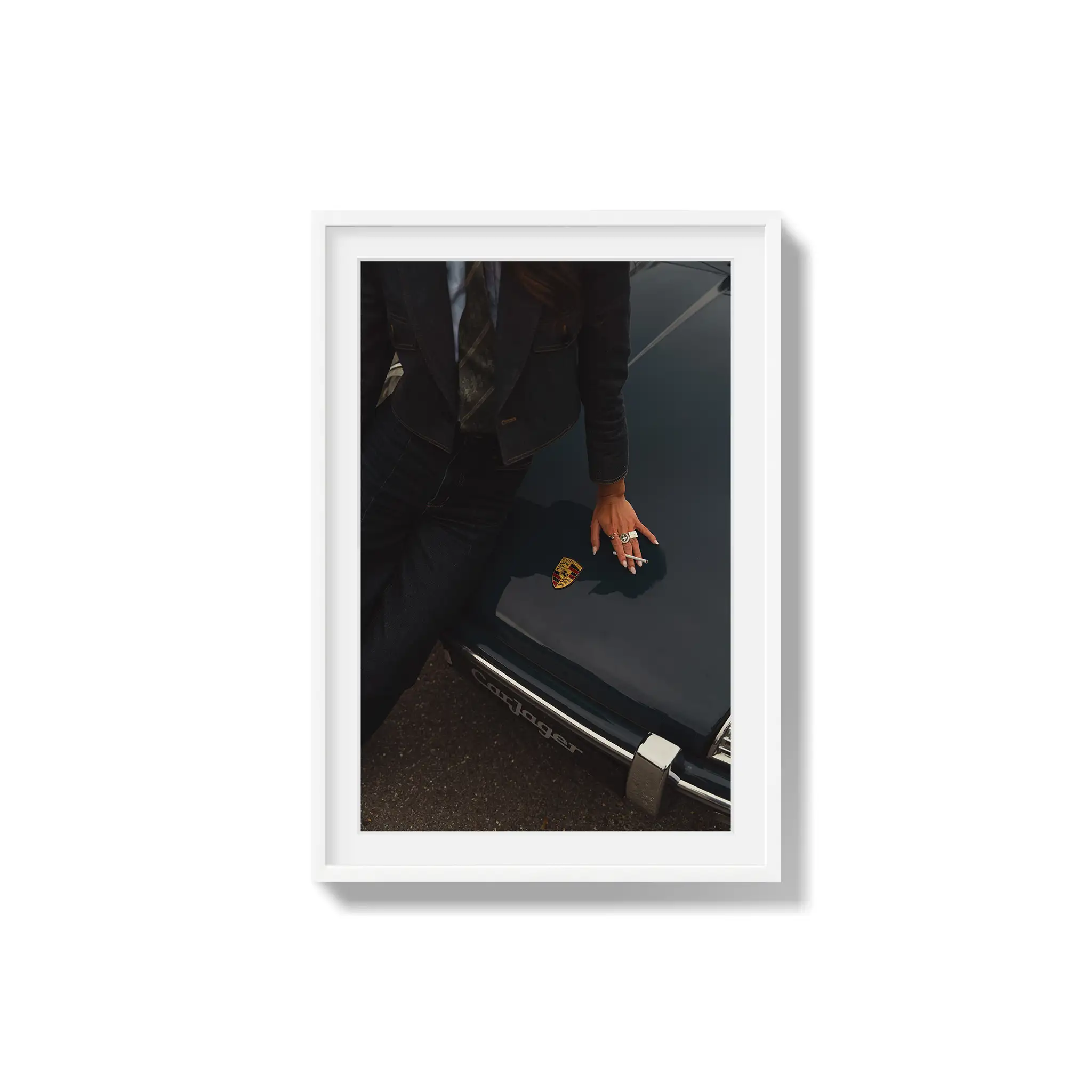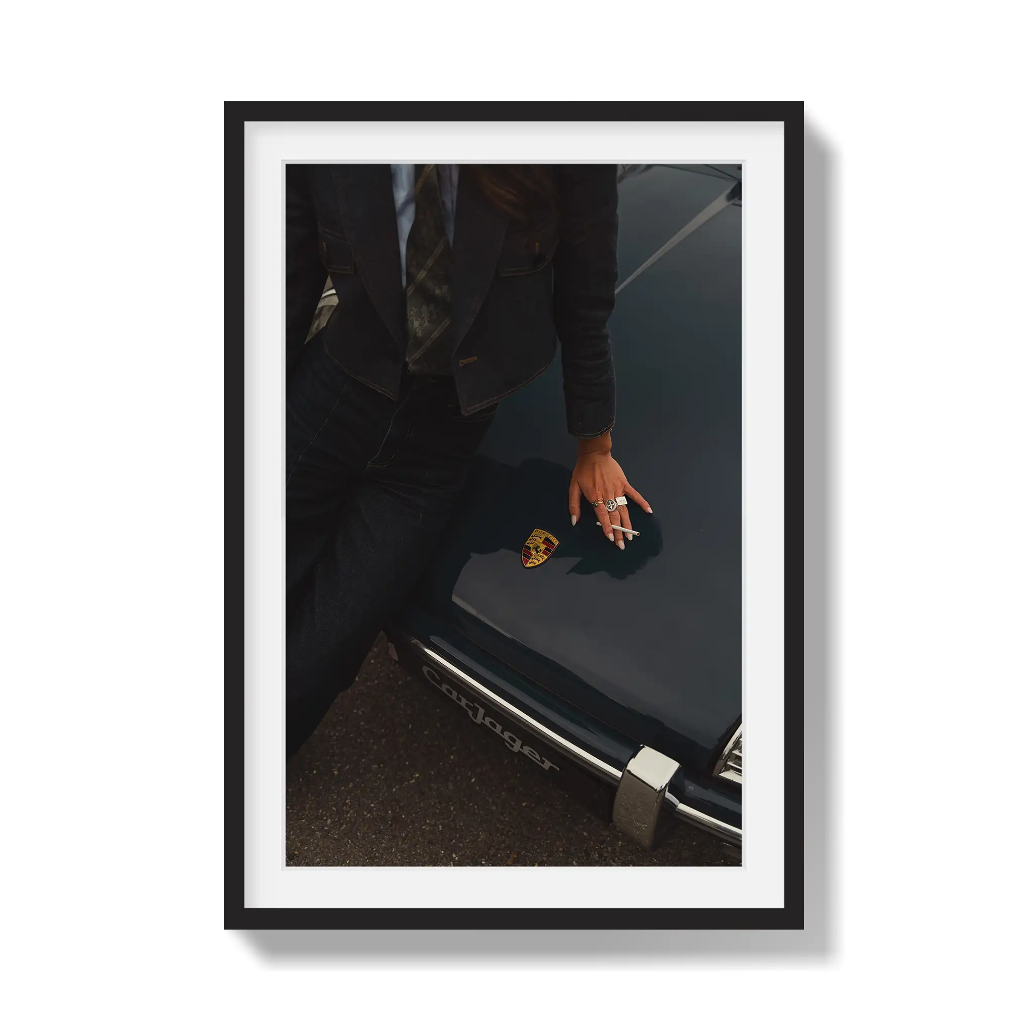 Still, nichts lautes. Der Motor läuft. Die Art von Eleganz, die man nicht anzieht, sondern besitzt. - "French Breakfast" Automobil Kunstdruck des klassischen 911ers von Armand Maertens, gedruckt auf Premium-Papier, ready-to-hang.
