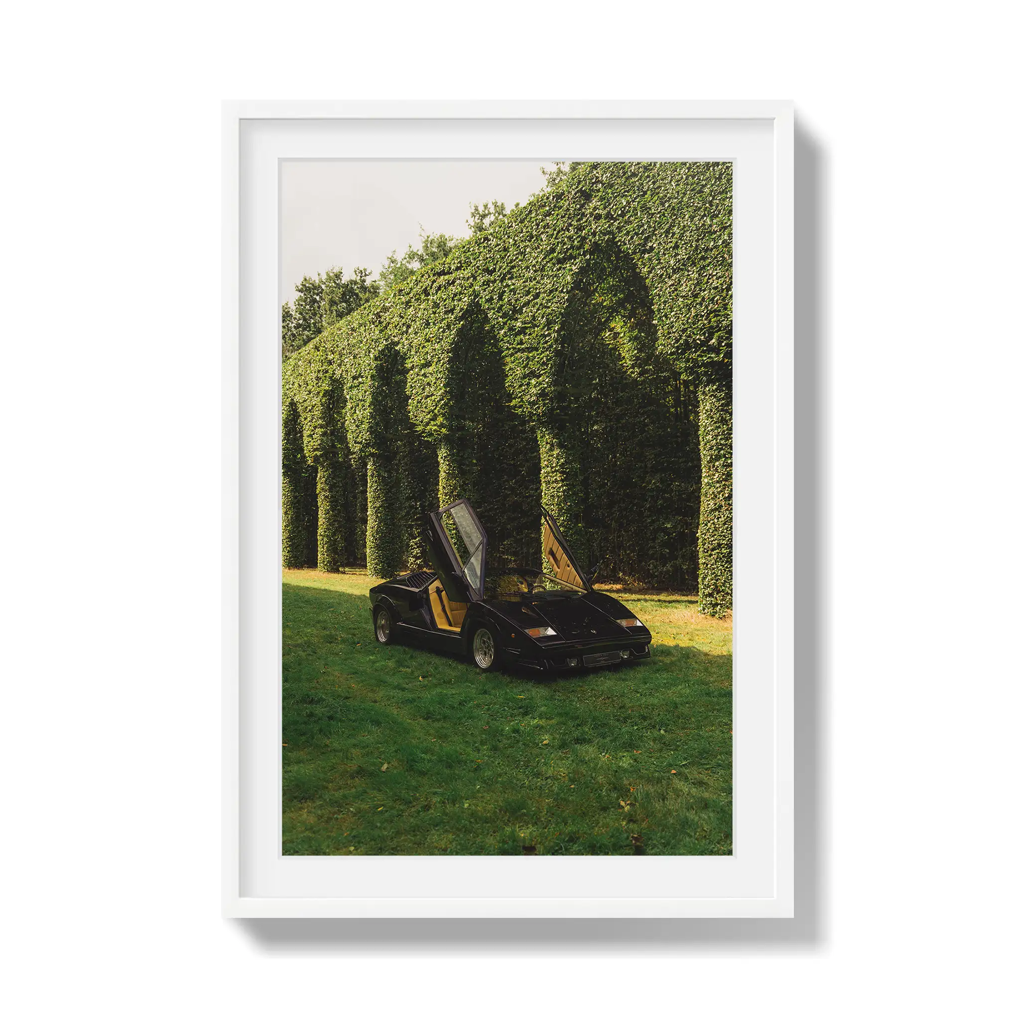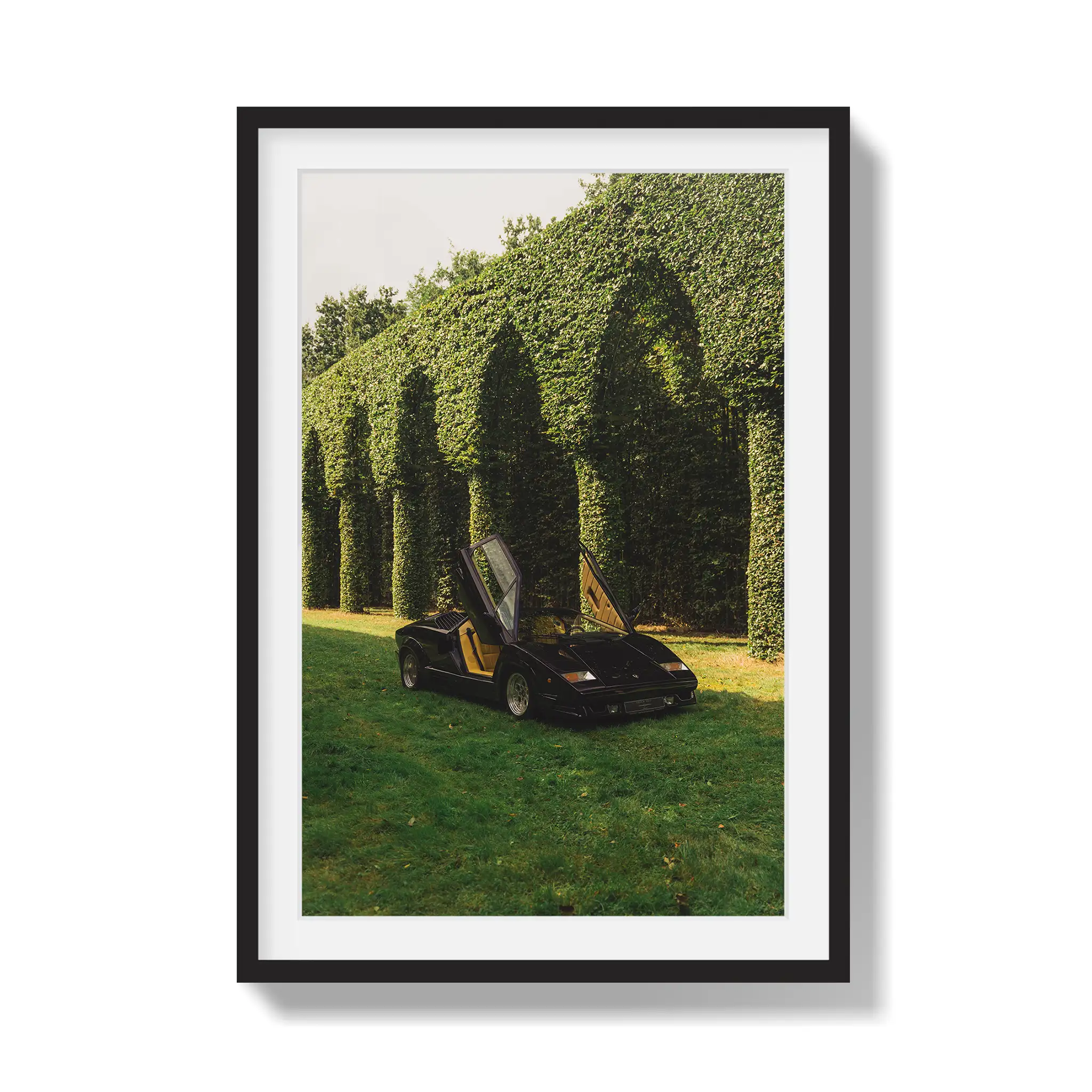 The Last One — ein Countach wie ein Schatten unter grünen Arkaden. Türen wie Flügel, Stille wie Nachhall.