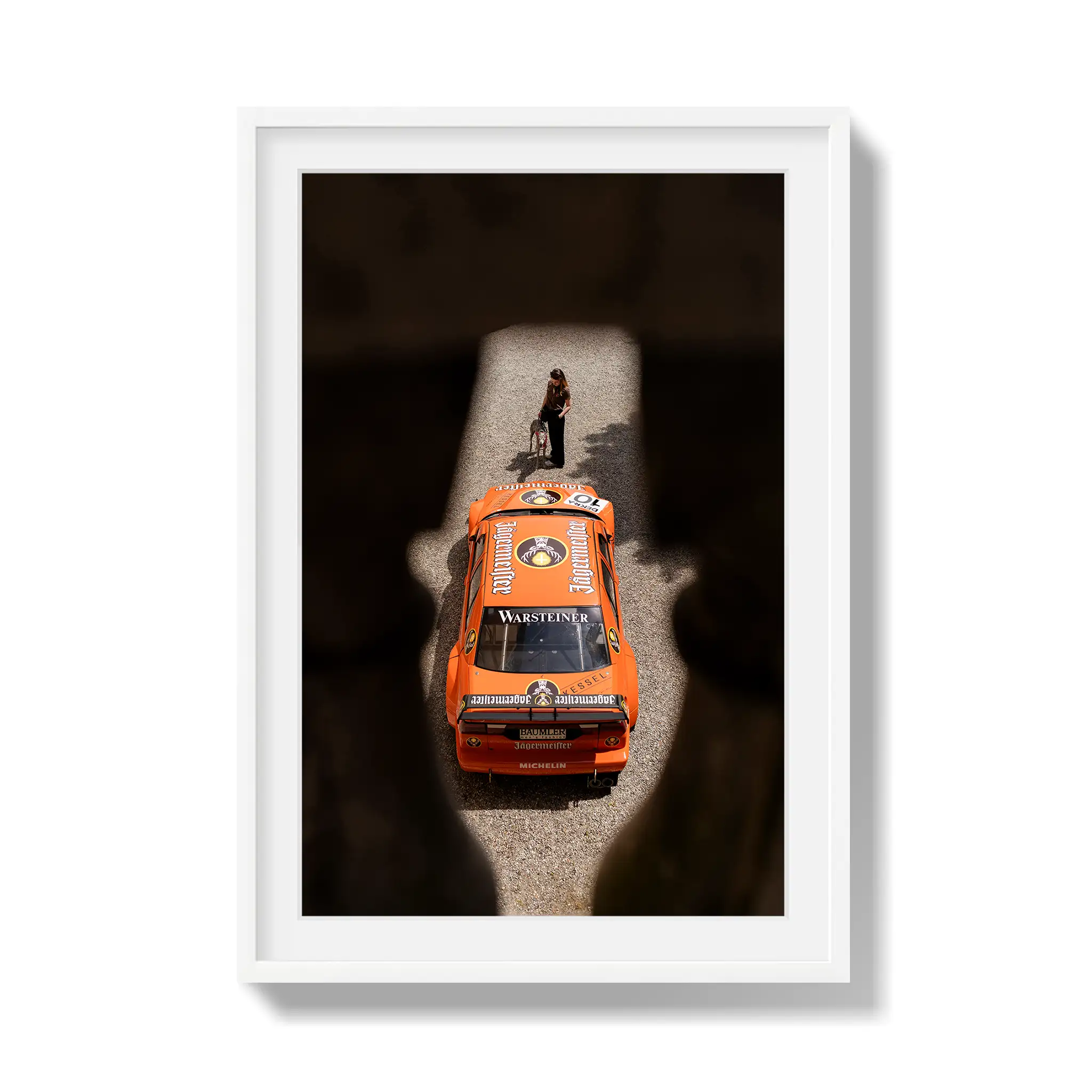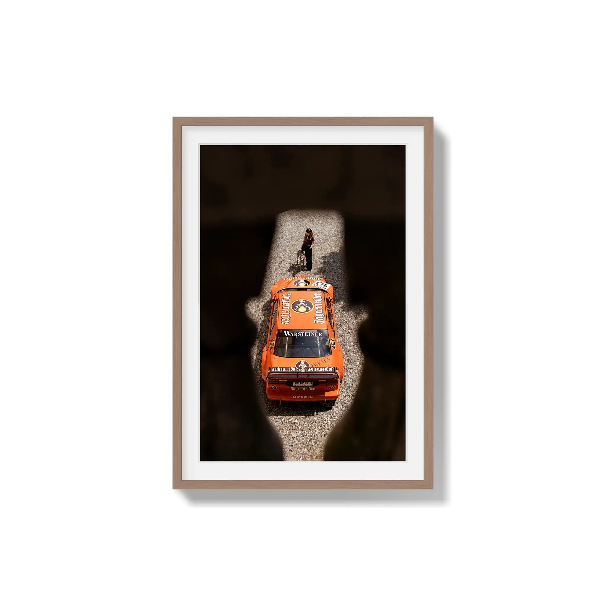 Der orangefarbene Alfa Romeo, voller Geschichte und Hitze, steht im Kies. Daneben eine Frau, schlank, wach, mit Windhund an der Seite – als hätte sie das Tier gerade von einem Spaziergang zurückgeführt, oder als würde sie gleich losgehen.