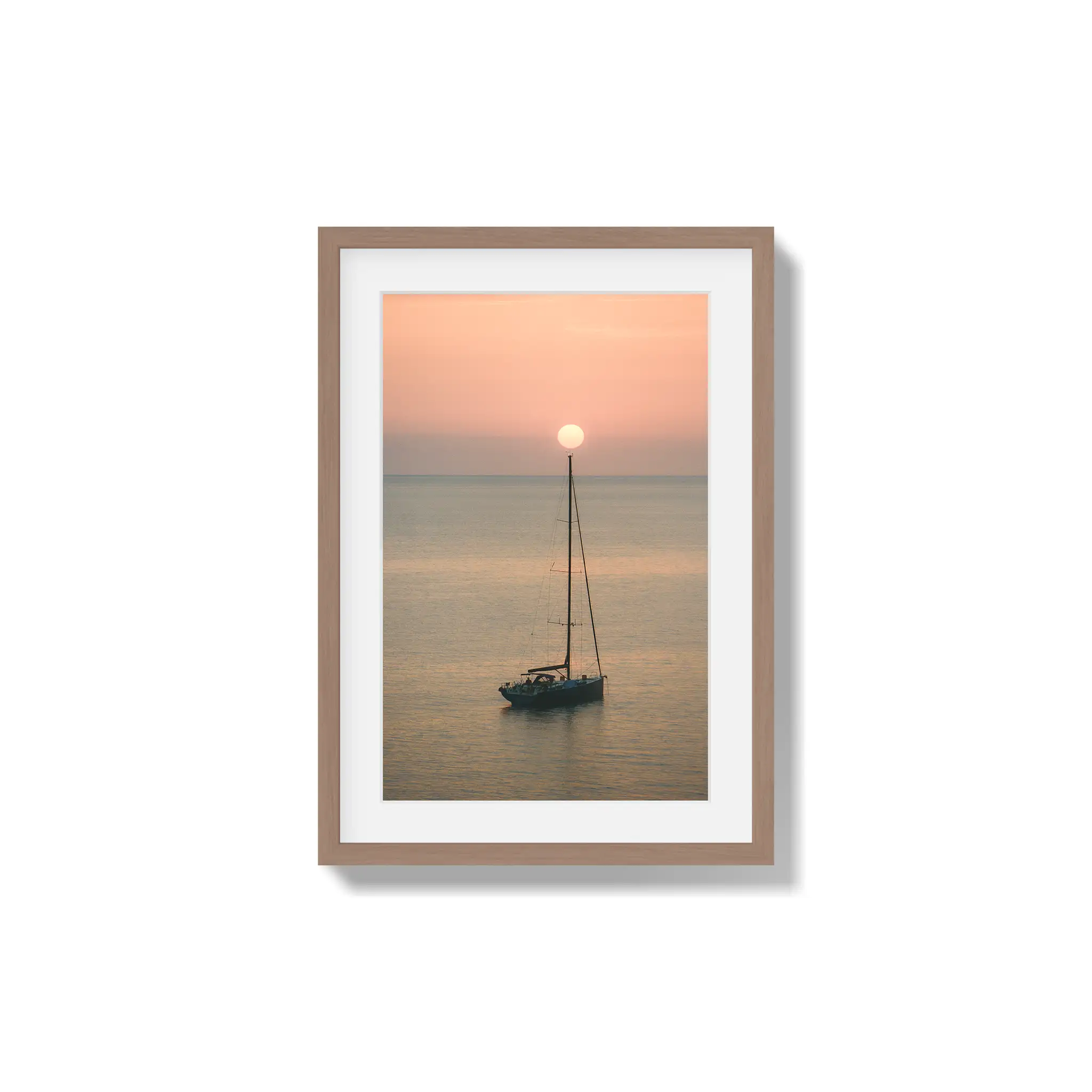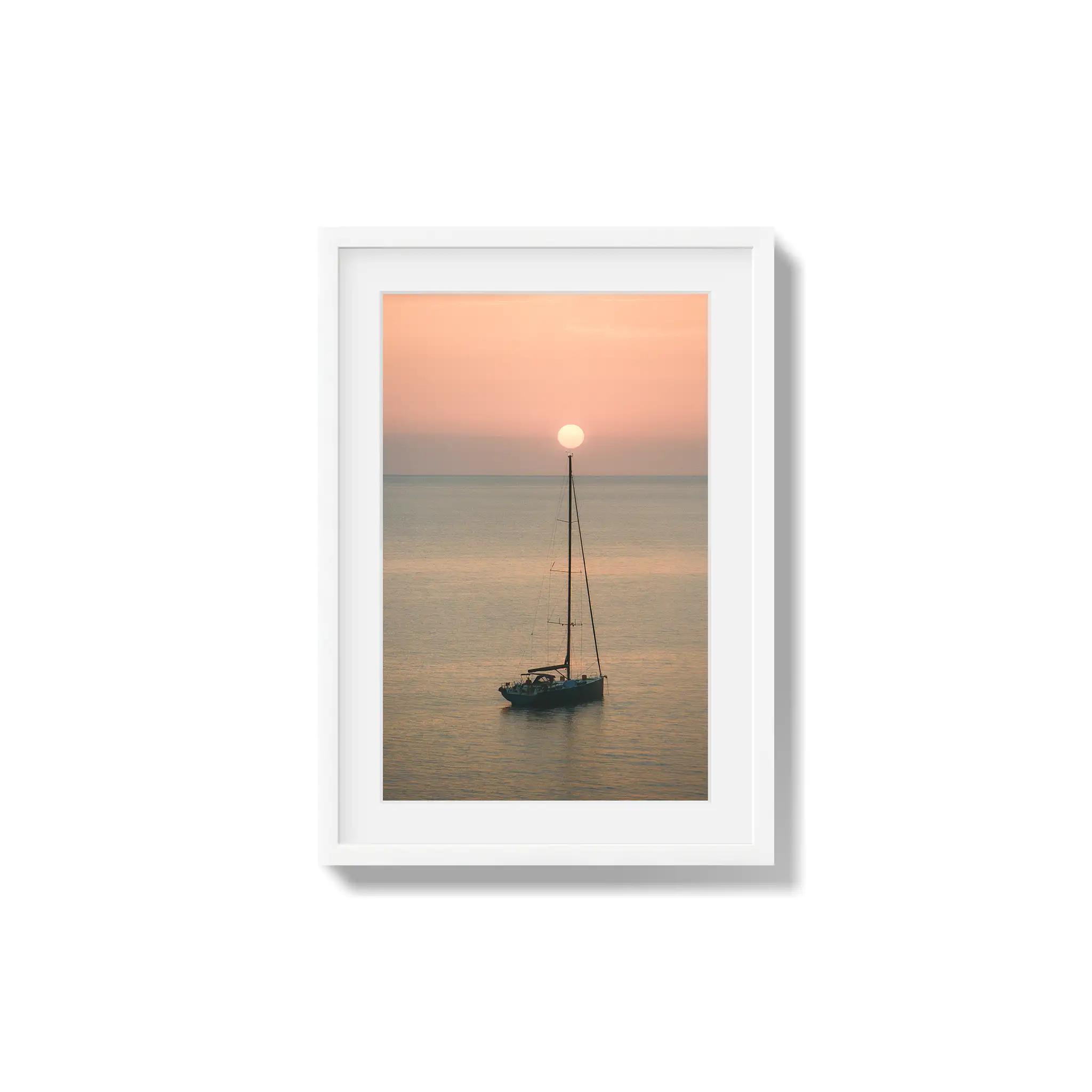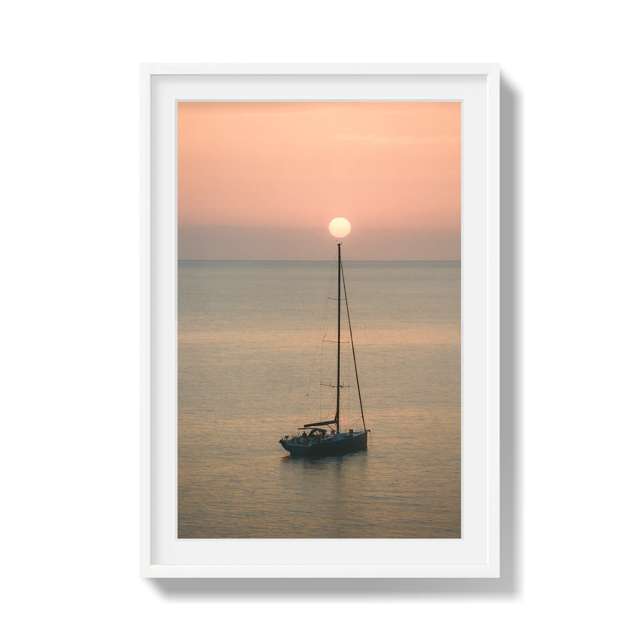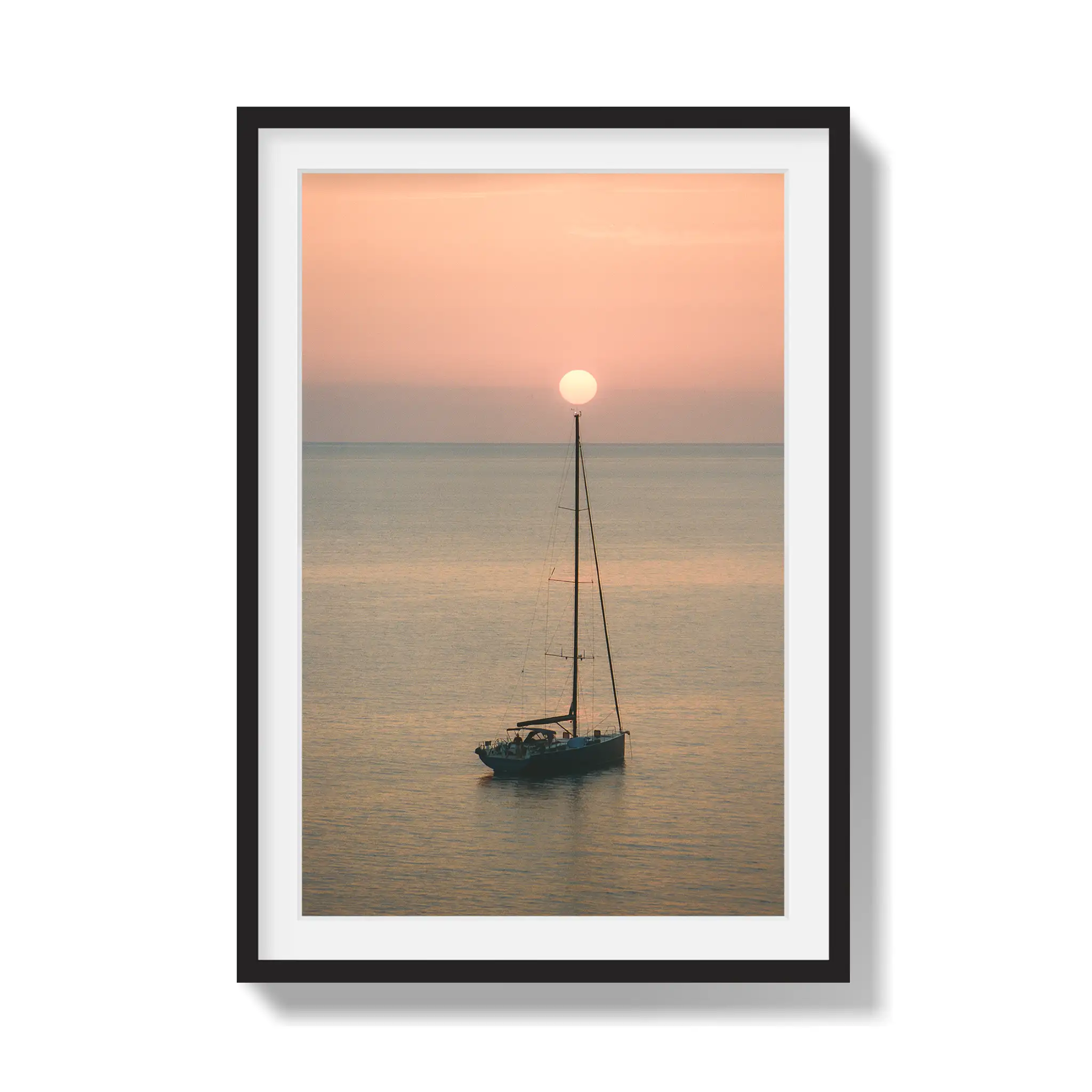 Ein Boot ruht auf stillem Wasser, die Sonne sitzt wie eine glühende Frucht auf dem Mast. Alles scheint eingefangen in goldene Ruhe – als hätte jemand den Moment in flüssigem Bernstein konserviert. Keine Bewegung, kein Geräusch, nur das warme Flirren zwischen Himmel und See.