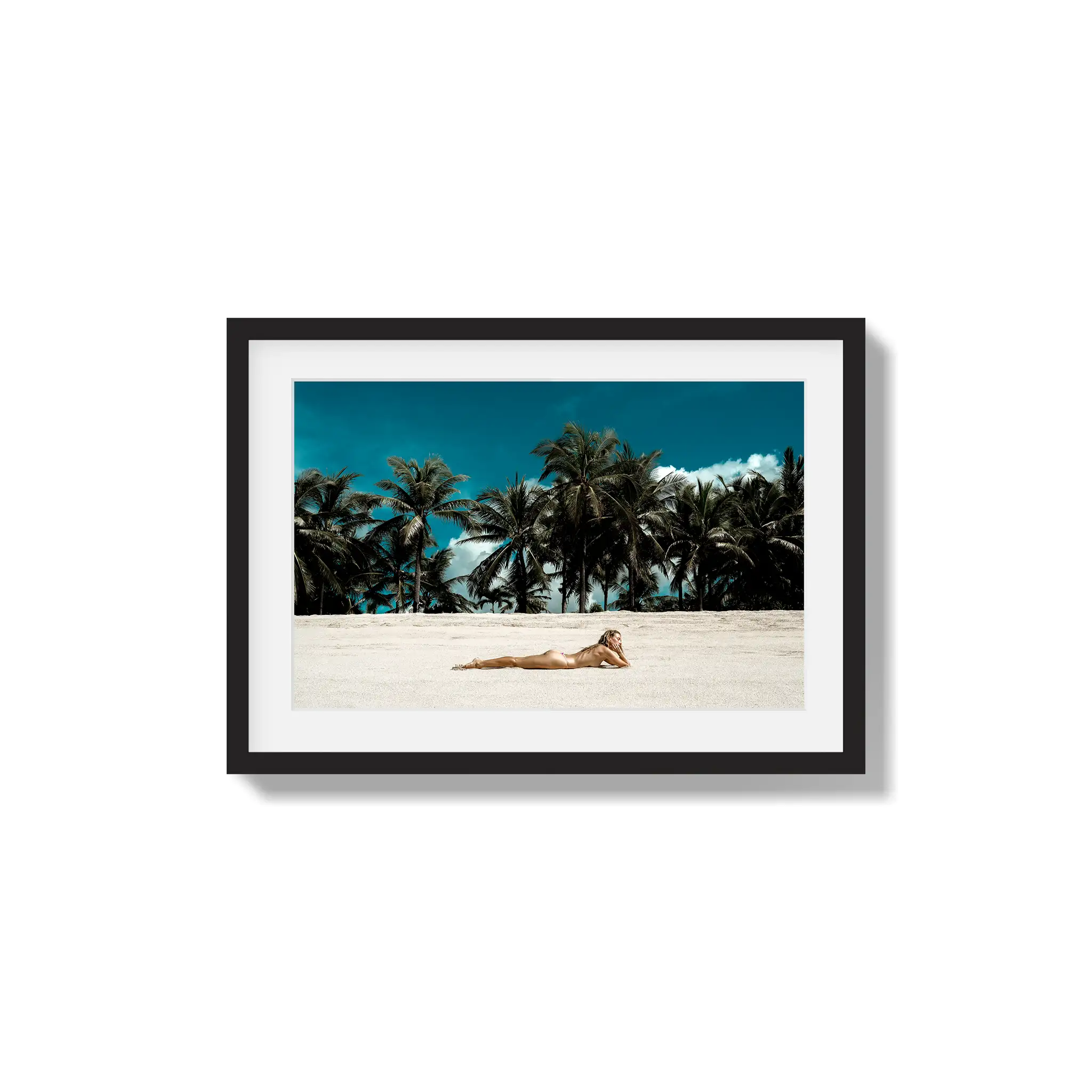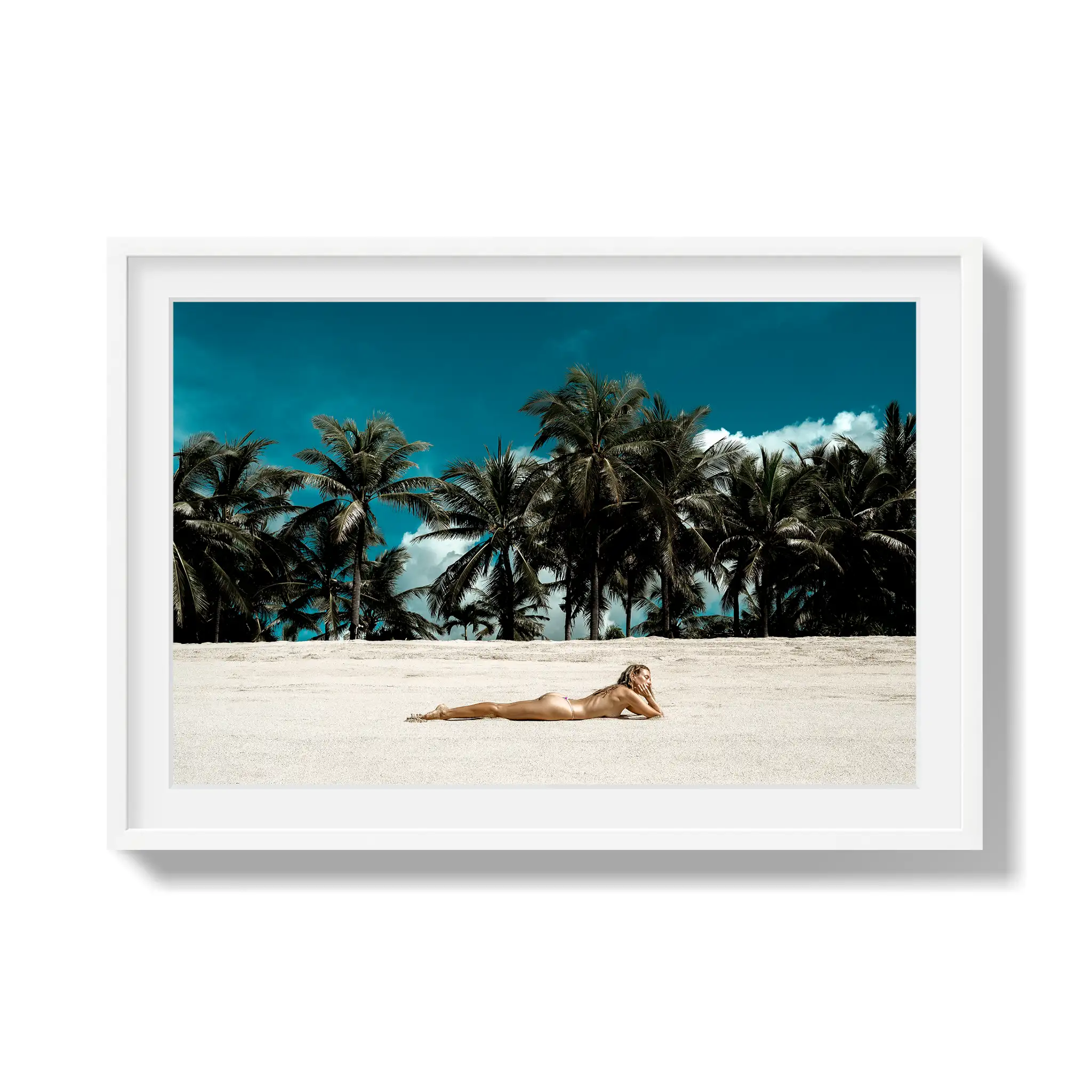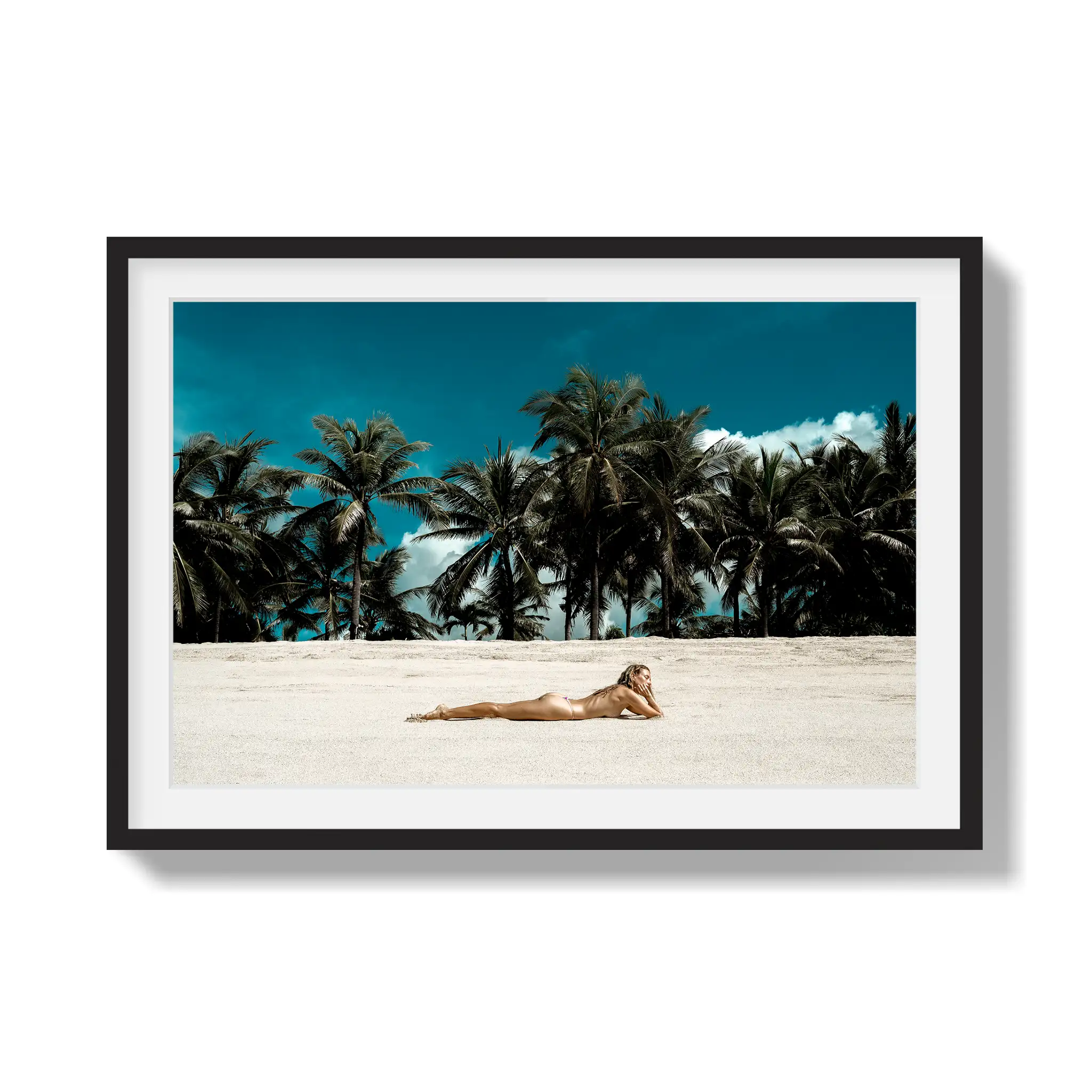 Sie liegt im warmen Sand, eingerahmt von Palmen, die sich kaum bewegen. Ihr Rücken glüht noch vom Tag, aber ihr Blick ist woanders – nicht bei den Wellen, nicht bei der Sonne. Vielleicht denkt sie an ihn, vielleicht an etwas, das sie verloren hat, oder an etwas, das nie kam.