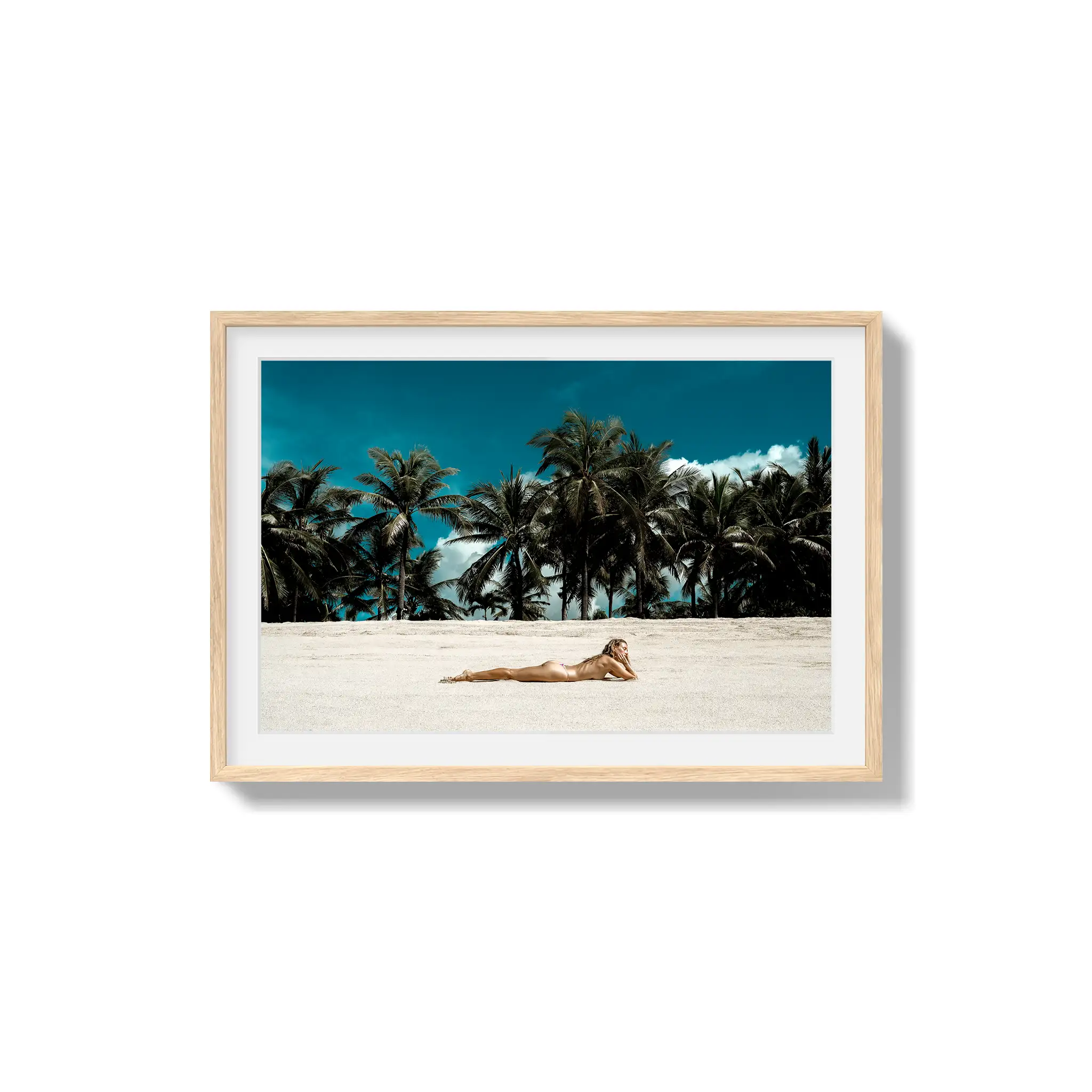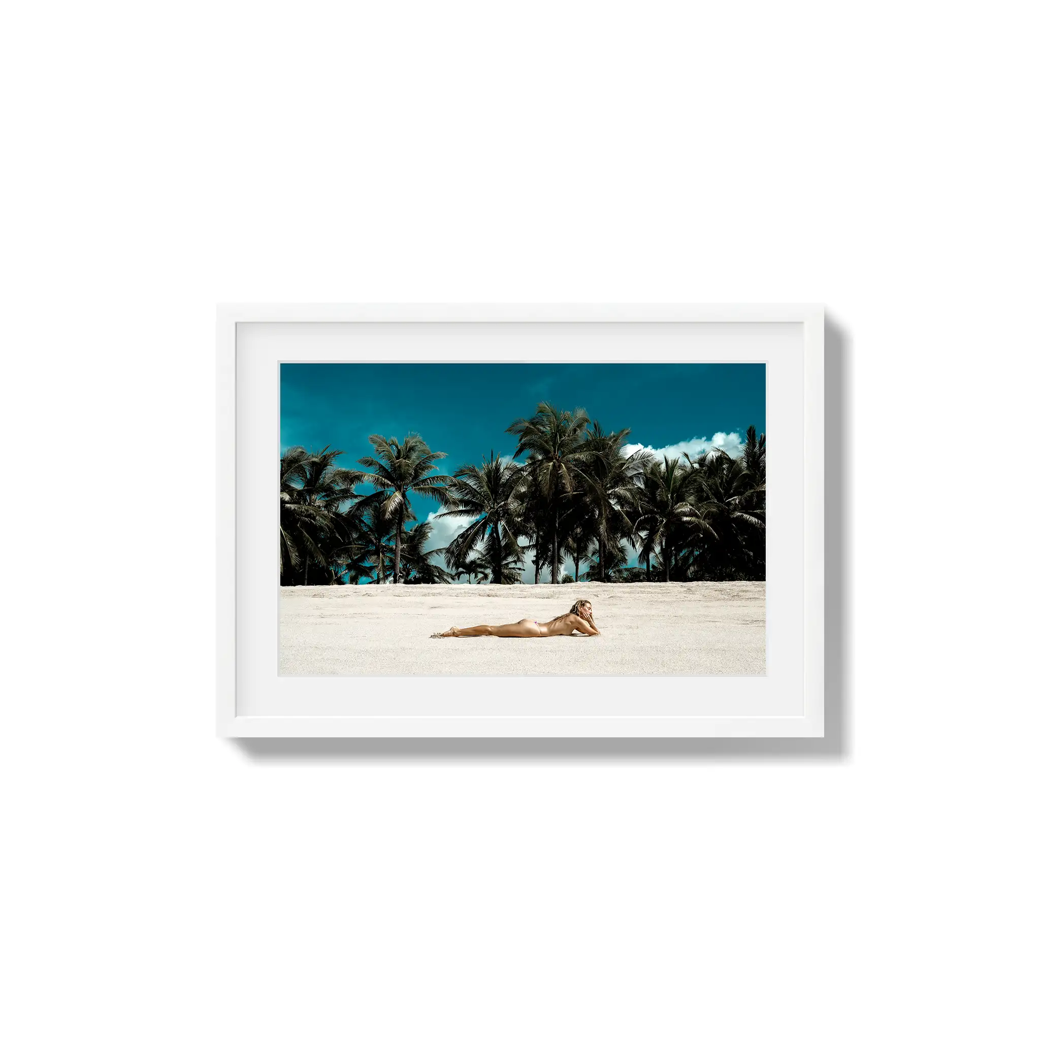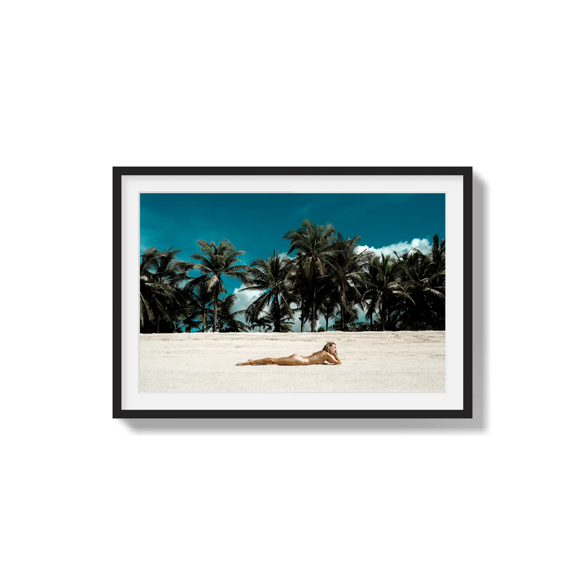Sie liegt im warmen Sand, eingerahmt von Palmen, die sich kaum bewegen. Ihr Rücken glüht noch vom Tag, aber ihr Blick ist woanders – nicht bei den Wellen, nicht bei der Sonne. Vielleicht denkt sie an ihn, vielleicht an etwas, das sie verloren hat, oder an etwas, das nie kam.