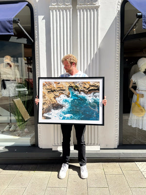 Unsere Small-, Medium- und Large-Drucke kommen in klassischen Holzrahmen mit einem 5 cm breiten Passepartout, das das Foto umgibt und so für eine edle Optik sorgt.
