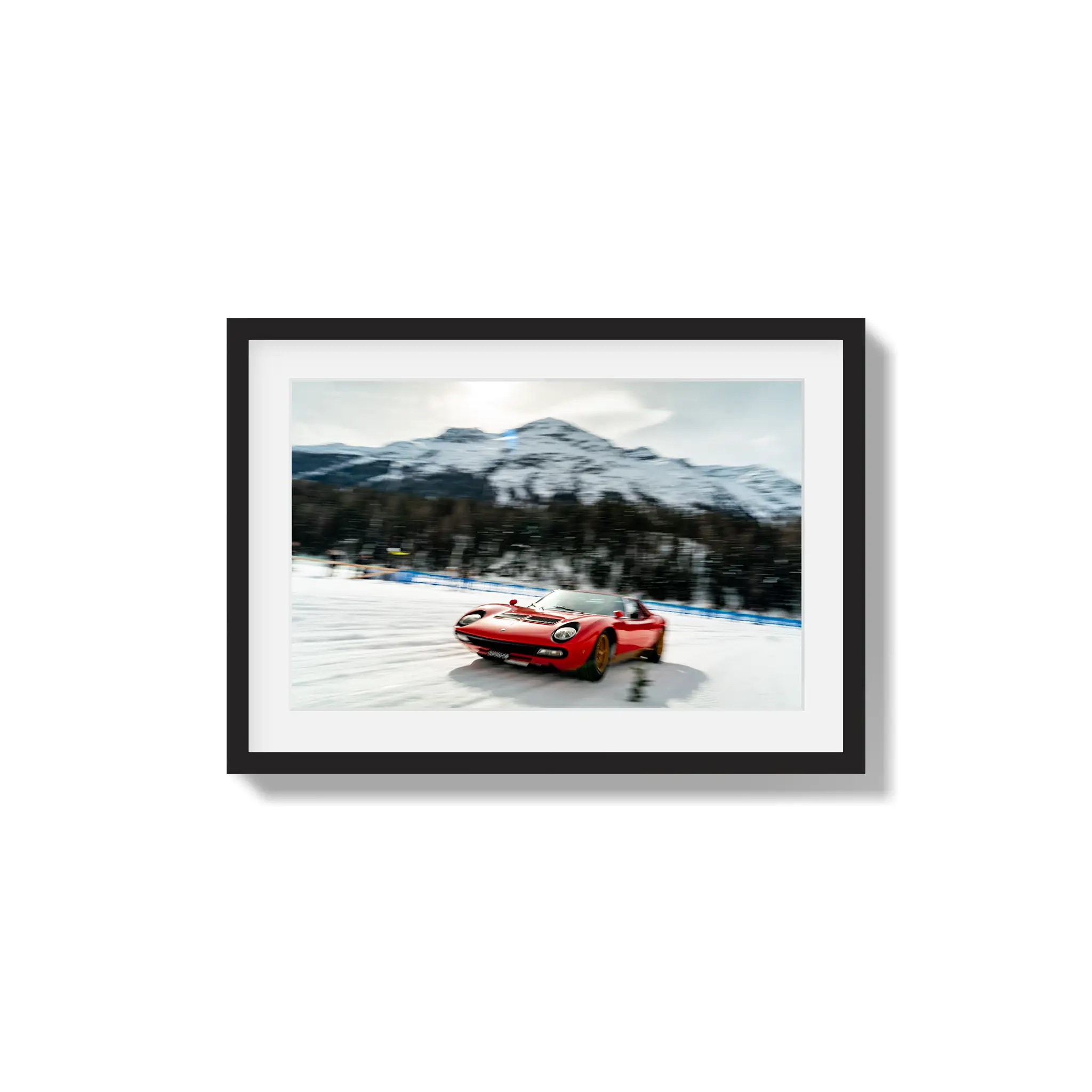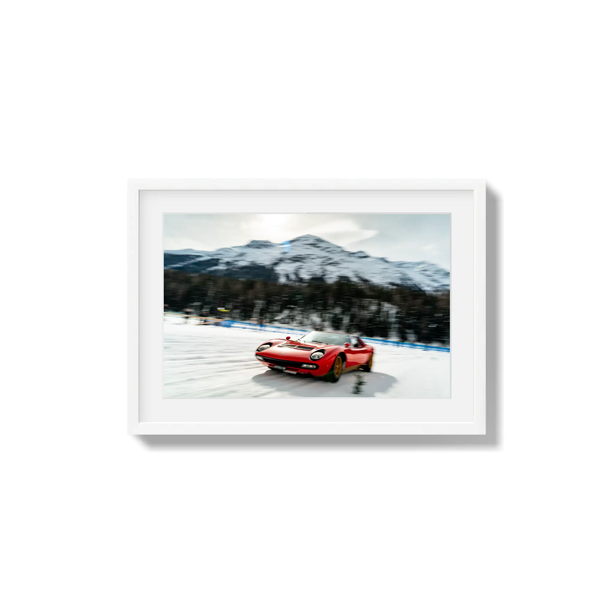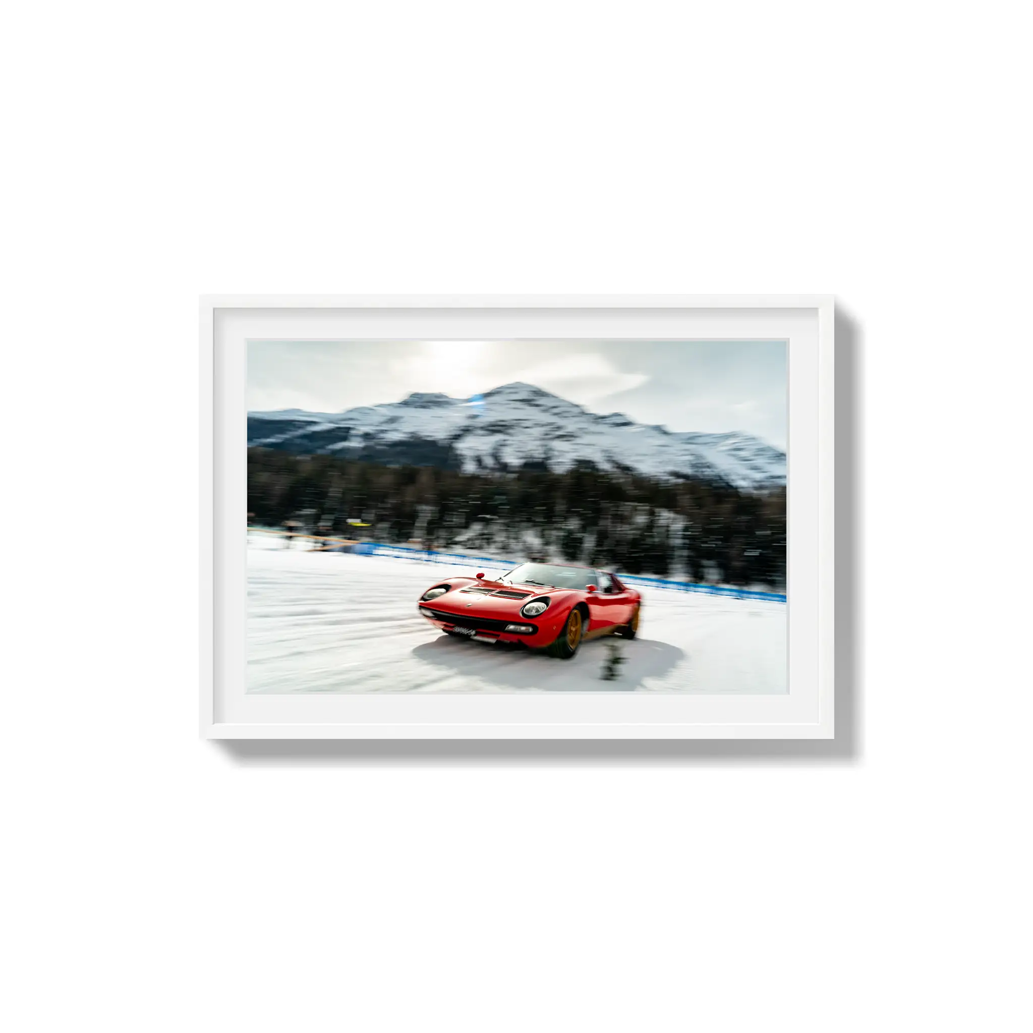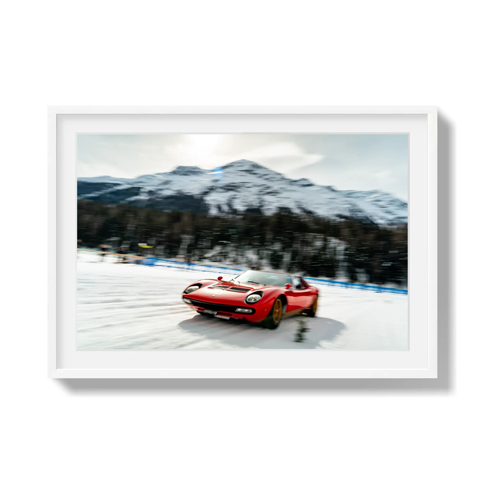 Luca Martini freezes the instant between control and surrender — the red Miura slicing through the Alpine white, speed dissolving into color. A timeless study of elegance, power, and precision.