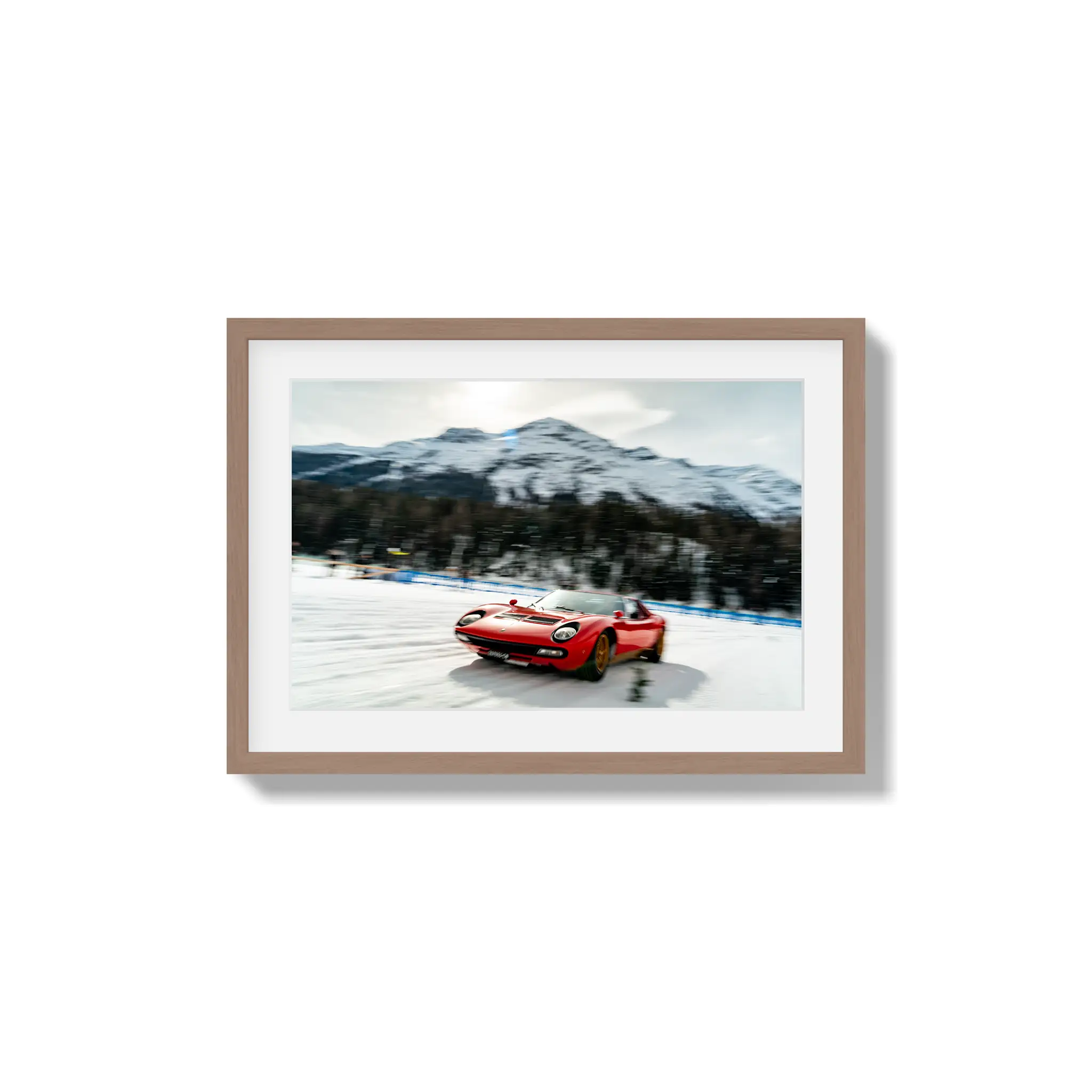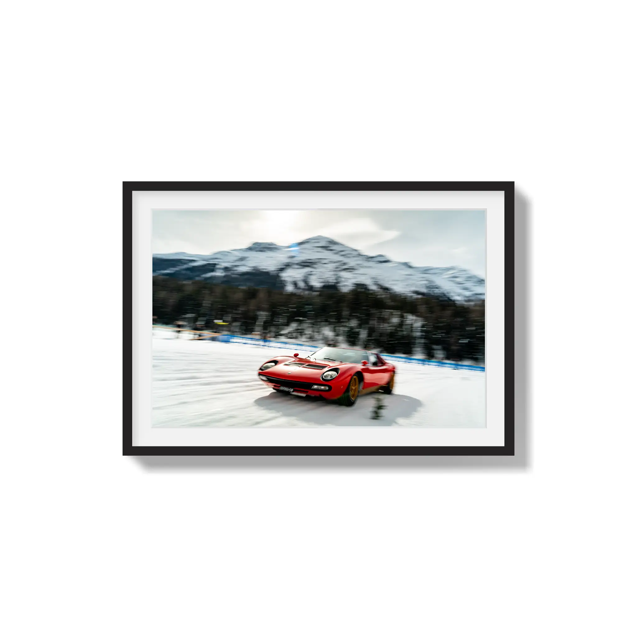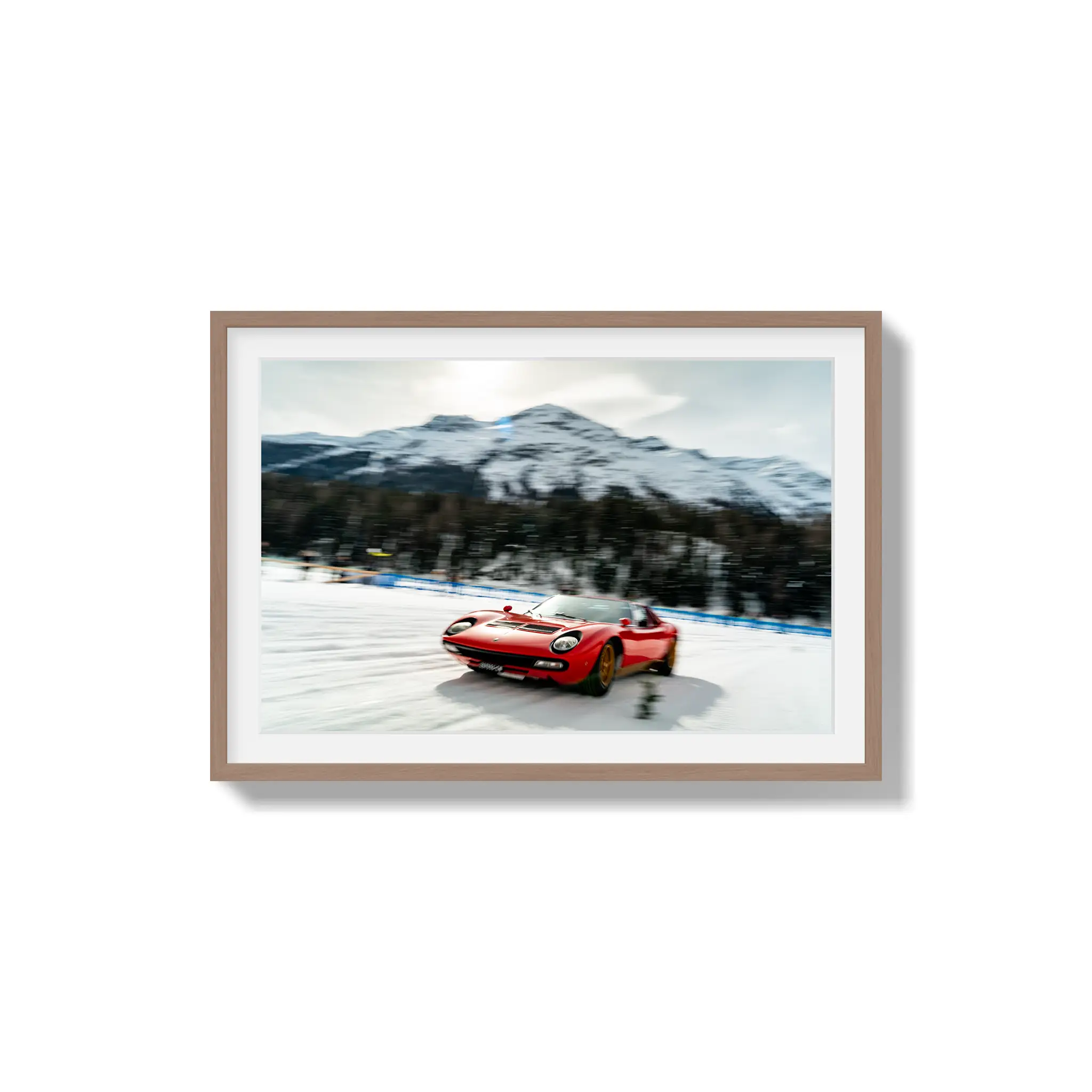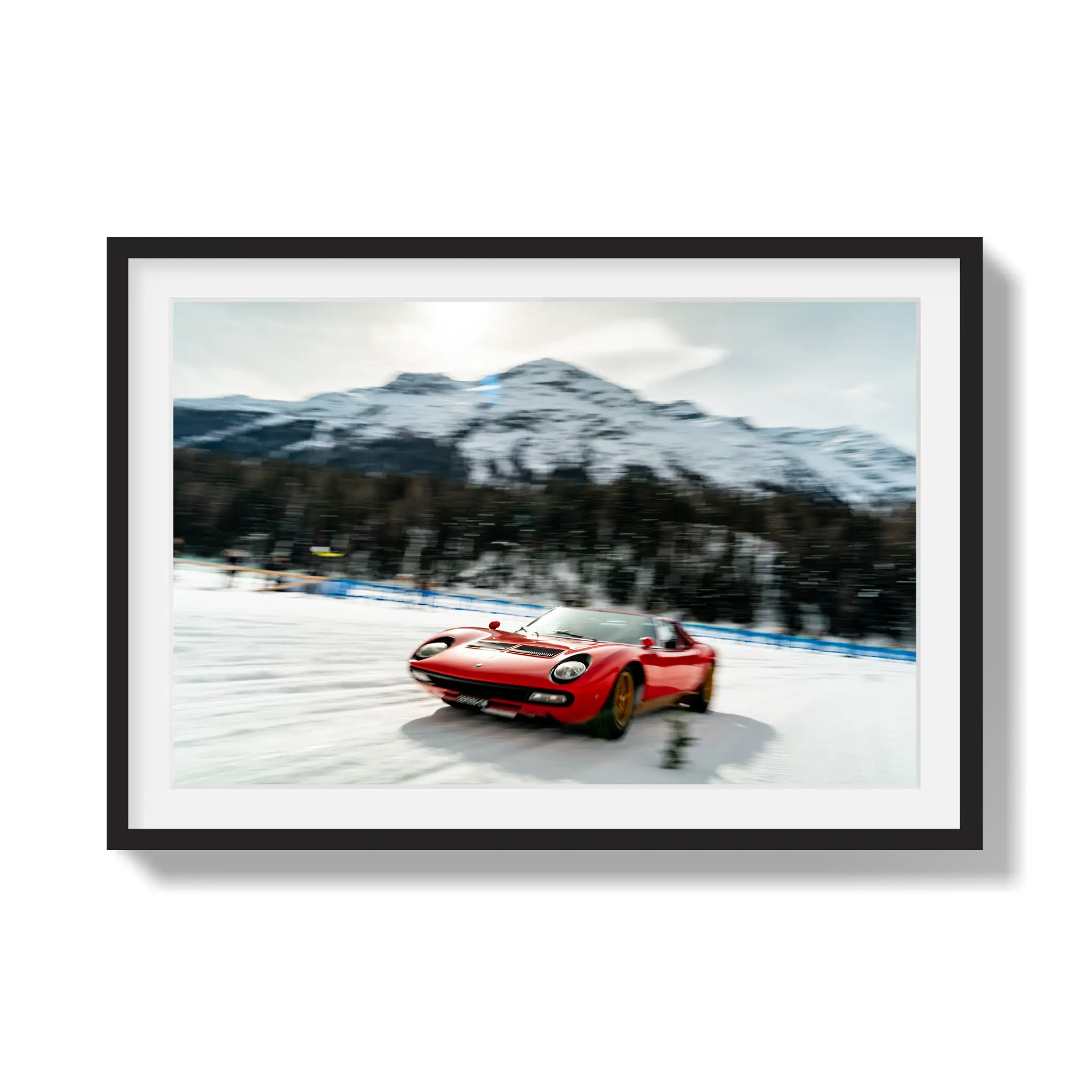 Luca Martini freezes the instant between control and surrender — the red Miura slicing through the Alpine white, speed dissolving into color. A timeless study of elegance, power, and precision.