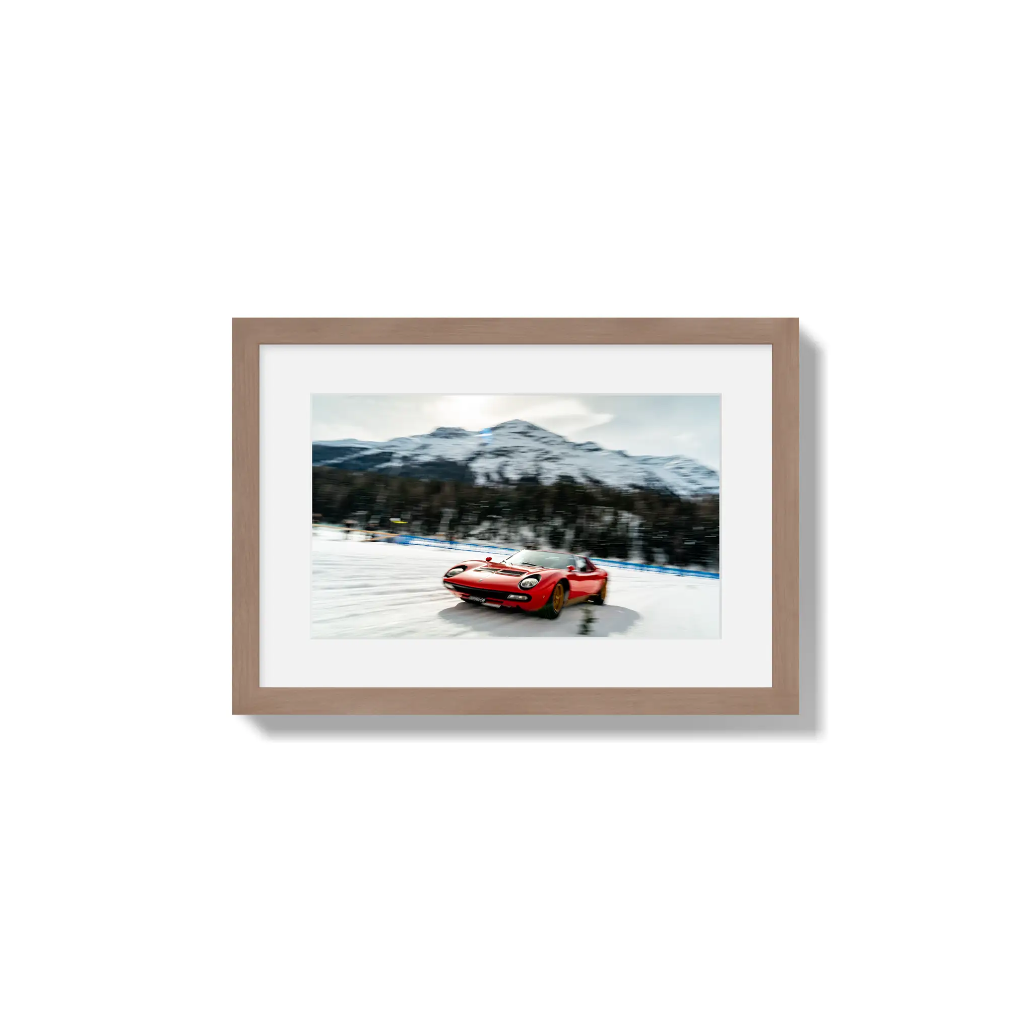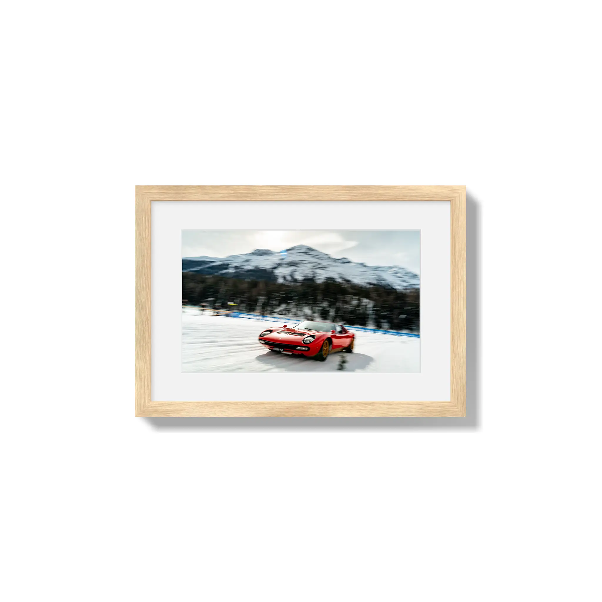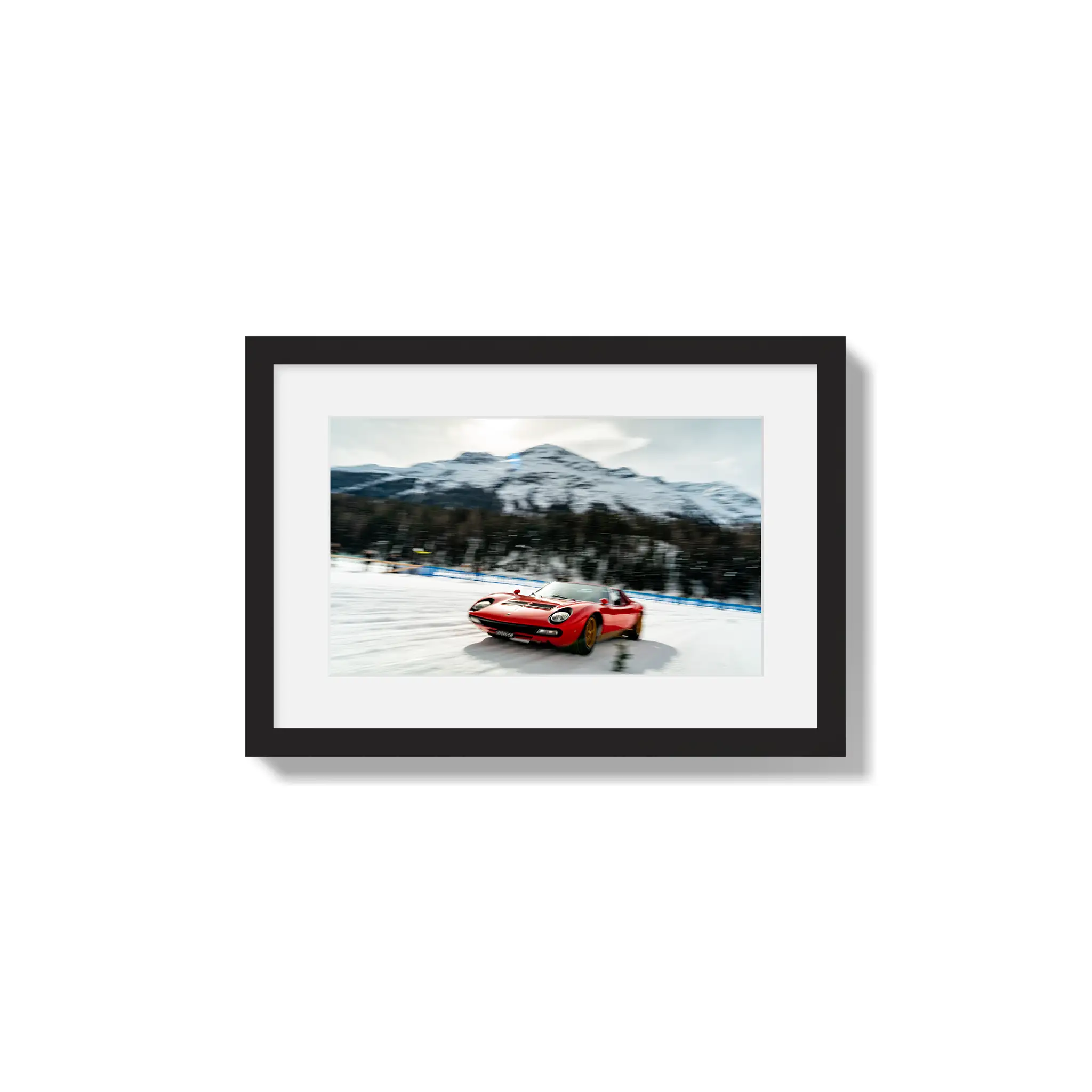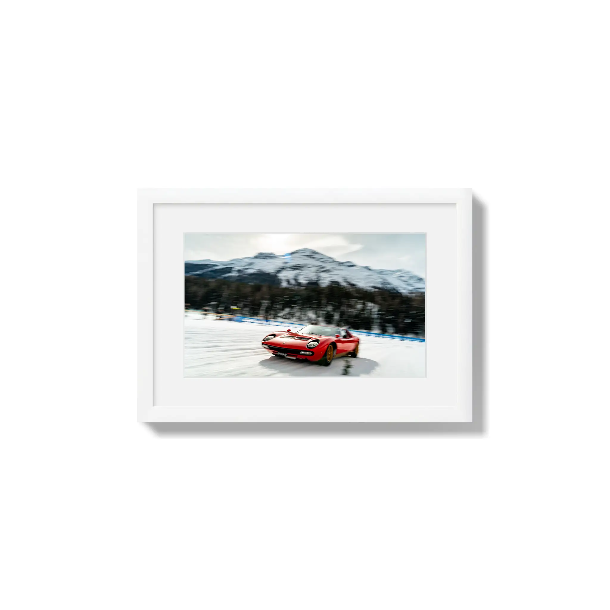 Luca Martini freezes the instant between control and surrender — the red Miura slicing through the Alpine white, speed dissolving into color. A timeless study of elegance, power, and precision.